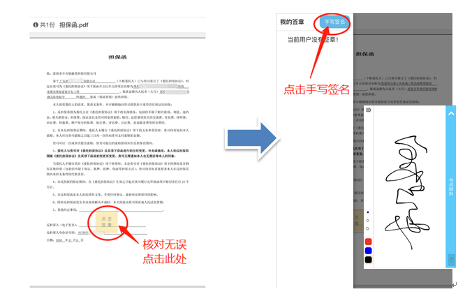 担保函核对签署页面:反担保函信息核对无误,点击‘点击签署’区域,选择手写签名