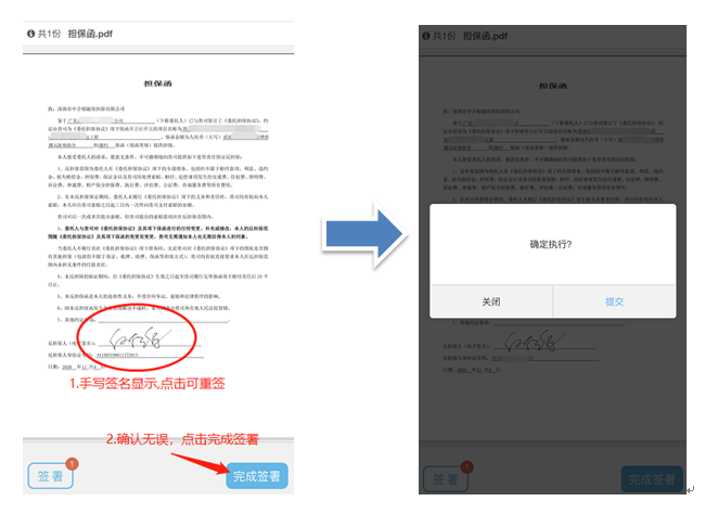 手写签署后点击‘完成签署’按钮进行签署确认操作,按屏幕提示点击提交,进入人脸识别验证。
