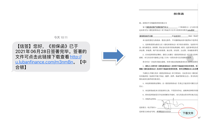 签署完成后,反担保人手机还会收到一条信息,提示已签署完毕,并可通过链接查看或下载已签署文件。