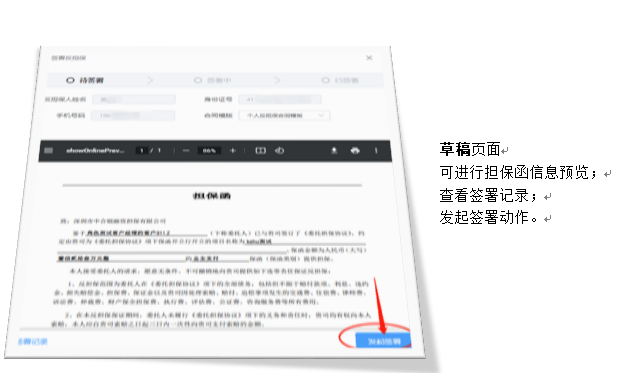 按钮,打开对应的反担保列表页面,在右侧操作栏点击【签署反担保】按钮,发起签署。
