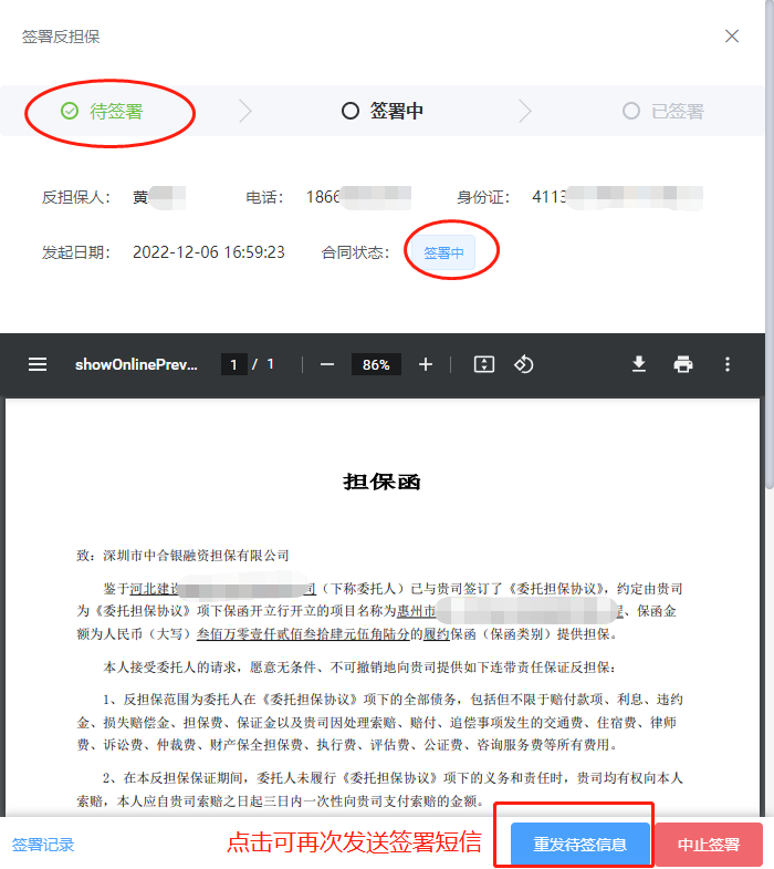 反担保电子签约重发待签信息 操作指南手册 电子签约 重发待签信息 创建时间:2022-01-14 13:46 阅读: 当发起签署后,若出现待签人未收信息或信息丢失的情况。 可点击【待签署】按钮,在左侧页面可见【重发待签信息】,点击按钮,可再次发送签署短信。