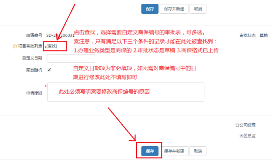 商保编号自定义指引 操作指南手册 创建时间:2023-06-12 08:54 阅读: 商保编号自定义指引: 1、在全部选项卡中找到商保编号自定义 2、点击新建,创建商保编号自定义记录,填写相关内容后保存并提交待审批。 点击提交后需要检查一下审批流程是否正确,正确的审批流程为:客户经理提交—-分公司经理审批—-大区总监审批—-市场部审批—-总经理审批。 3、申请提交并审批通过后,对应审批表记录自动更新。客户经理可通过审批表中的【商保格式上传/下载】来查看确认更新后的结果。