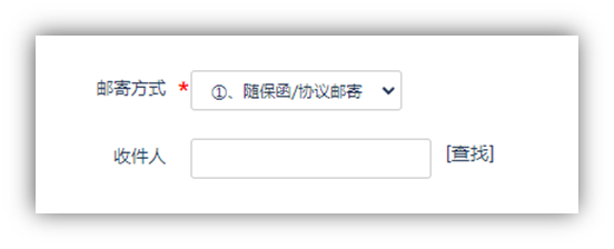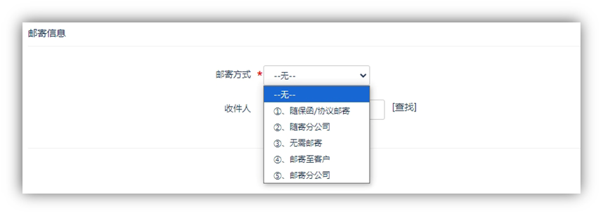 2、其中邮寄方式①②③无需填写收件人信息,邮寄方式④⑤需在联系人中创建收件人,并用查找的方式选择收件人;邮寄分公司是指邮寄给客户经理本人,也需在联系人中创建收件人信息,地址需填分公司地址。