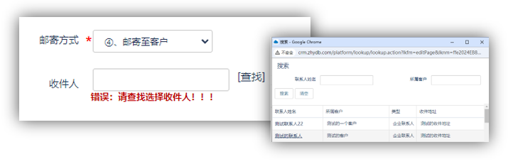 2、系统中收件人信息填写方式统一调整为查找联系人的方式,如下图