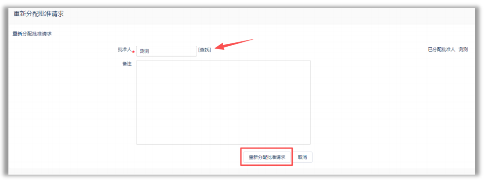 此处按审批到达先后顺序展示,最近的记录展示在最前面。点击操作中的重新分配,可对该条记录进行审批人的重新分配,如下图,点击查找可重新指定批准人(请注意审批执行同级同范围原则)
