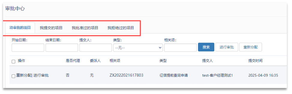 点击【管理全部】按钮,可进入审批中心。审批中心按类型分为待审批的项目、我提交的项目、我批准过的项目、我拒绝过的项目,点击可进行不同类型的切换选择,并且每个类型可进行独立筛选。