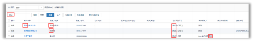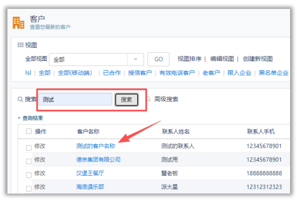 2)视图搜索是点击进入视图后的搜索,是以所输入内容与当前视图中所设定的所有字段值模糊匹配的搜索结果(视图中所设定的字段可由视图所有人编辑调整)