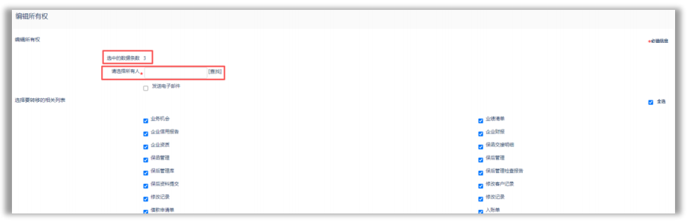 点击批量转移按钮,进入到分配页面,可见选中的数据条数。点击查找选择要分配的人员并勾选要同时转移的相关列表(与该客户记录所关联的对象记录)