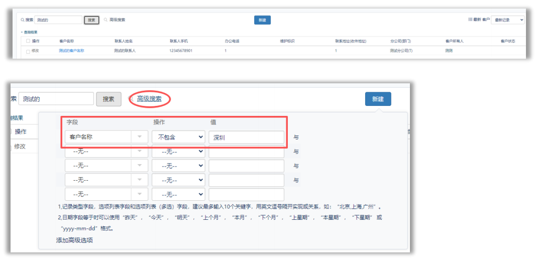 1)选项卡搜索是以输入内容与当前选项卡所有字段值模糊匹配的搜索结果(当前选项卡字段设置是由系统后台统一设置,不可随意变更),点击高级搜索还可以在当前范围内进一步设置筛选条件