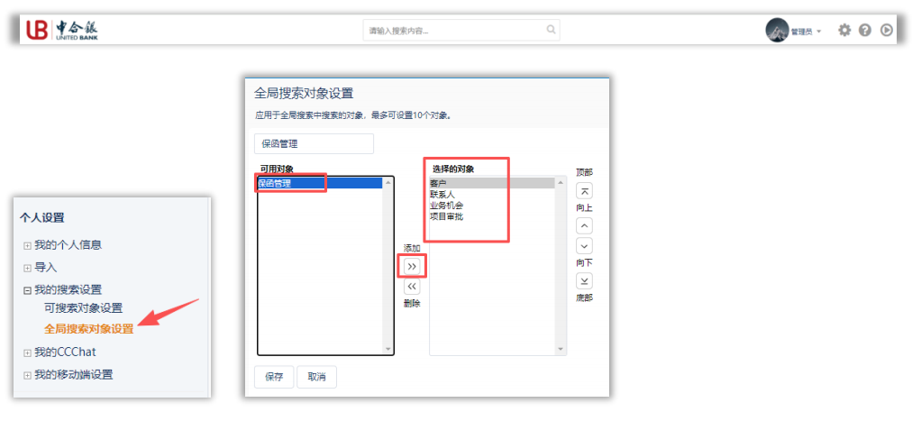 通过系统主页的搜索栏进行搜索(需提前配置可搜索对象,最多设置10个对象)