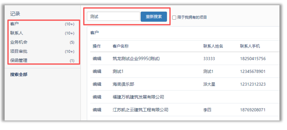 该角色在系统中主要查询对象有客户、联系人、销售日志、项目审批、保函管理等,以下将举例展示如何进行查询。