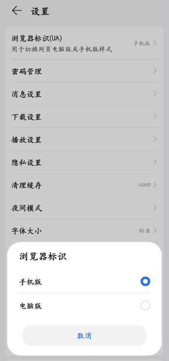 第二步:设置浏览器标识或模式为手机版、移动版(每种浏览器描述不太一样,可参考图片)