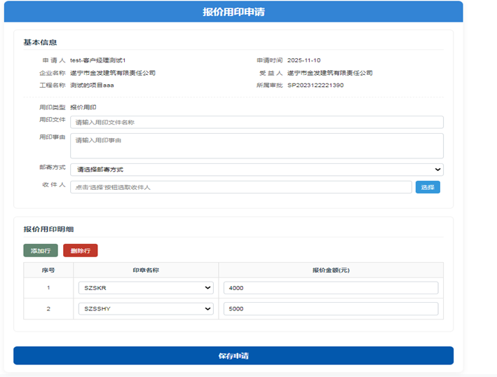 3、填写用印文件、用印事由、邮寄方式,在报价明细中添加需要申请的印章名称(印章数量可通过“添加行”、“删减行”进行操作)及对应的报价金额,填写无误后点击保存申请。