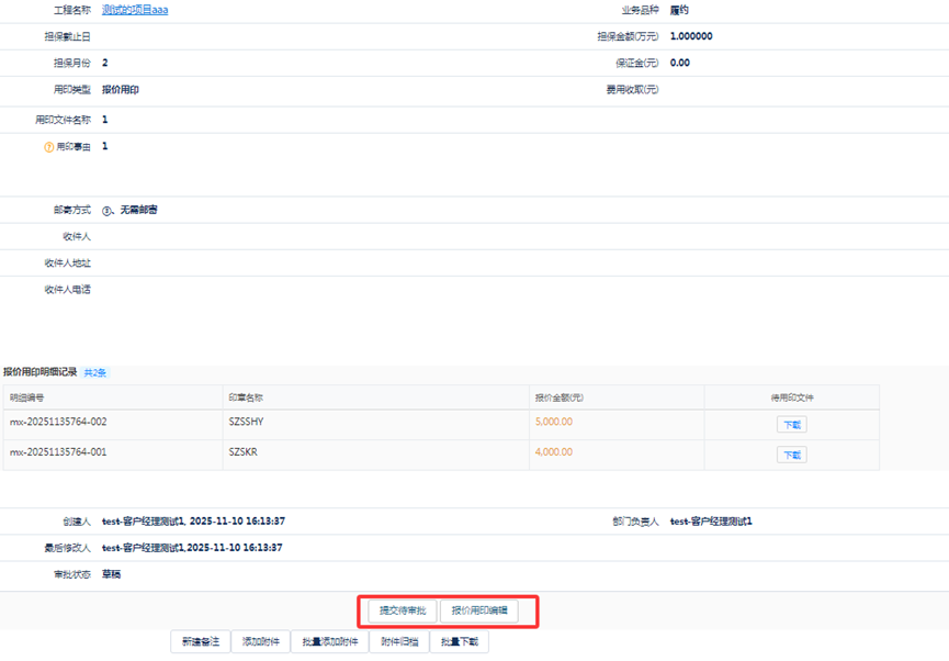 4、确定无误后可点击提交待审批,若需修改,点击报价用印编辑即可。